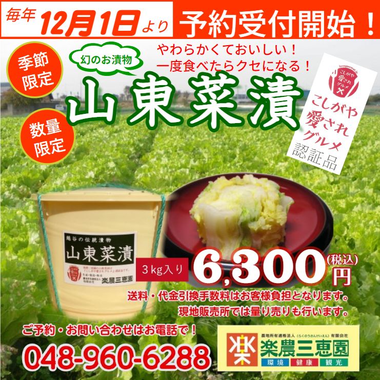 山東菜のお漬物は、楽農三恵園が収穫後すぐに自社の工場で加工した手作りのお漬物です。添加物は一切使用していませんので安心してお召し上がりください。